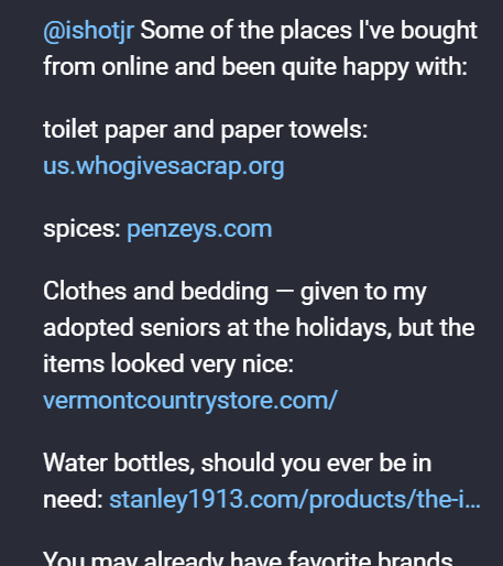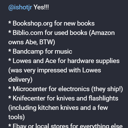 I think it was canceling Amazon Prime that kicked things off. With my renewal looming on January second, I took a moment to consider whether the $147.34 I hand over each year ($139 + 6% Michigan sales tax) to pretend that Amazon orders come with free shipping was worth it. It was New Year’s Eve. I had departed Hamburg at around 6am local time on just a few hours’ sleep, and it was now past 10pm in Detroit (i.e. more than 24 hours after I’d woken up that “day”). The lack of sleep, as well as the fact that I had just returned from a mind-blowingly egalitarian and anti-authoritarian German hacker event, 39c3, probably helped. So I did it: I pressed pause on Prime. It’s been almost a month, and I haven’t felt a thing. But I’ve also not really found replacements for everything I depended on Amazon for, versus abstaining on purchases and making do with what I have – itself of course a pleasant side effect. Amazon ordering has not necessarily been obviated completely, but I’ve made a commitment to find replacements, even if not all of them have been discovered or proven yet. A couple of weeks ago, I crowdsourced Amazon alternatives via Mastodon, and got some fantastic suggestions. But there was a problem: I’d gotten a taste for opting out from the oligarchy’s offerings, and I wanted to take it further. So I came up with a simple rubric to define how I would engage in commerce: no more increasing the wealth of billionaires.